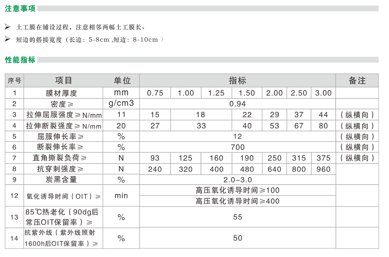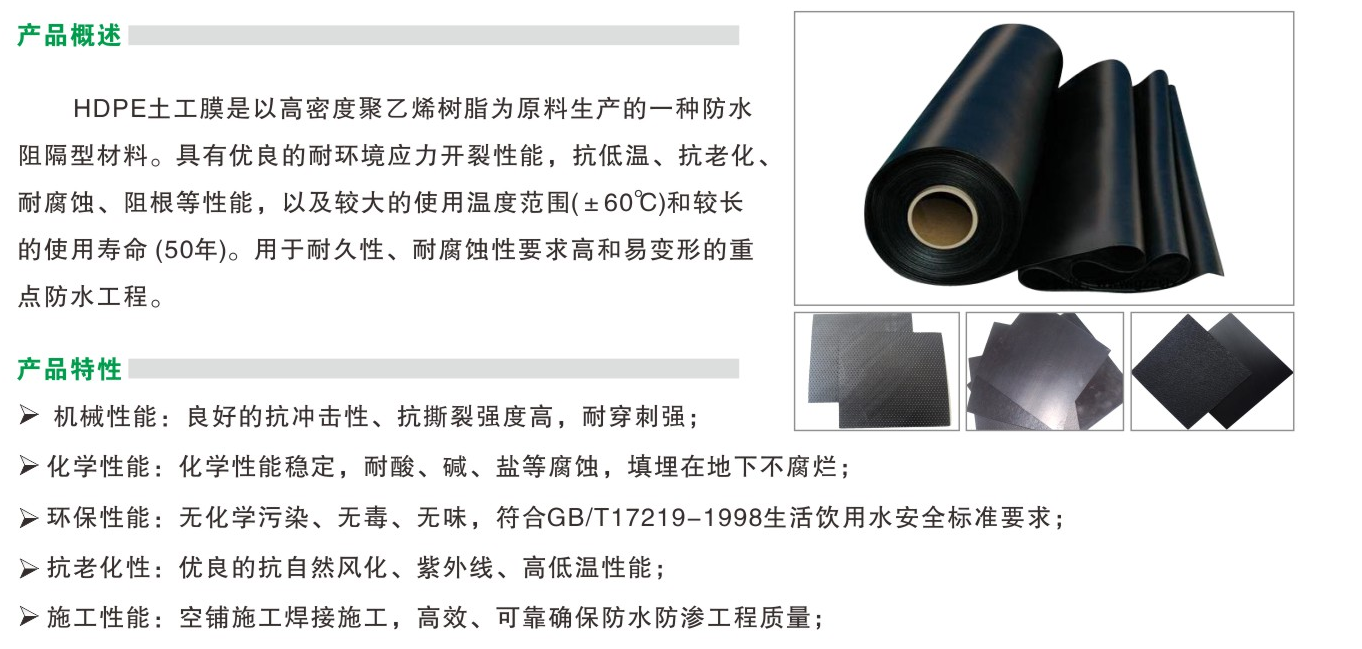 机械性能:良好的抗冲击性、抗撕裂强度高,耐穿刺强; 化学性能:化学性能稳定,耐酸、碱、盐等腐蚀,填埋在地下不腐烂; 环保性能:无化学污染、无毒、无味,符合GB/T17219-1998生活饮用水安全标准要求; 抗老化性:优良的抗自然风化、紫外线、高低温性能; 施工性能:空铺施工焊接施工,高效、可靠确保防水防渗工程质量;